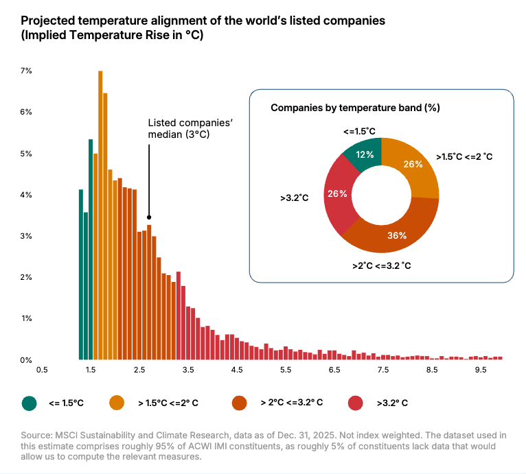 目前,有38%的公司排放轨迹与预计升温2°C或更低的目标相符,而只有12%的公司与将升温幅度限制在1.5°C或更低的更雄心勃勃的目标相符。