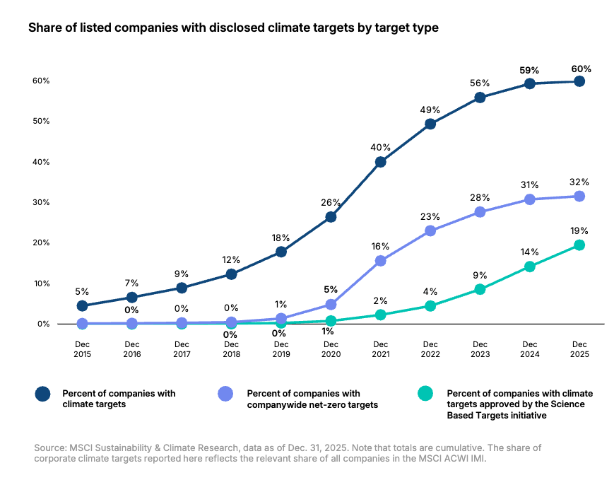 近日,MSCI发布2025年第四季度转型金融追踪报告(Transition Finance Tracker Q4 2025),报告评估了MSCI全球所有国家可投资市场指数(ACWI IMI)中各公司的排放轨迹和气候进展,并纳入了其“隐含温度上升”指标的数据,该指标用于评估投资组合与全球气候目标的一致性。报告发现,截至2025年12月31日,近五分之一(19%)的上市公司的气候目标已获得科学碳目标倡议(SBTi)的认可;近三分之一(32%)的公司设定了净零排放目标。